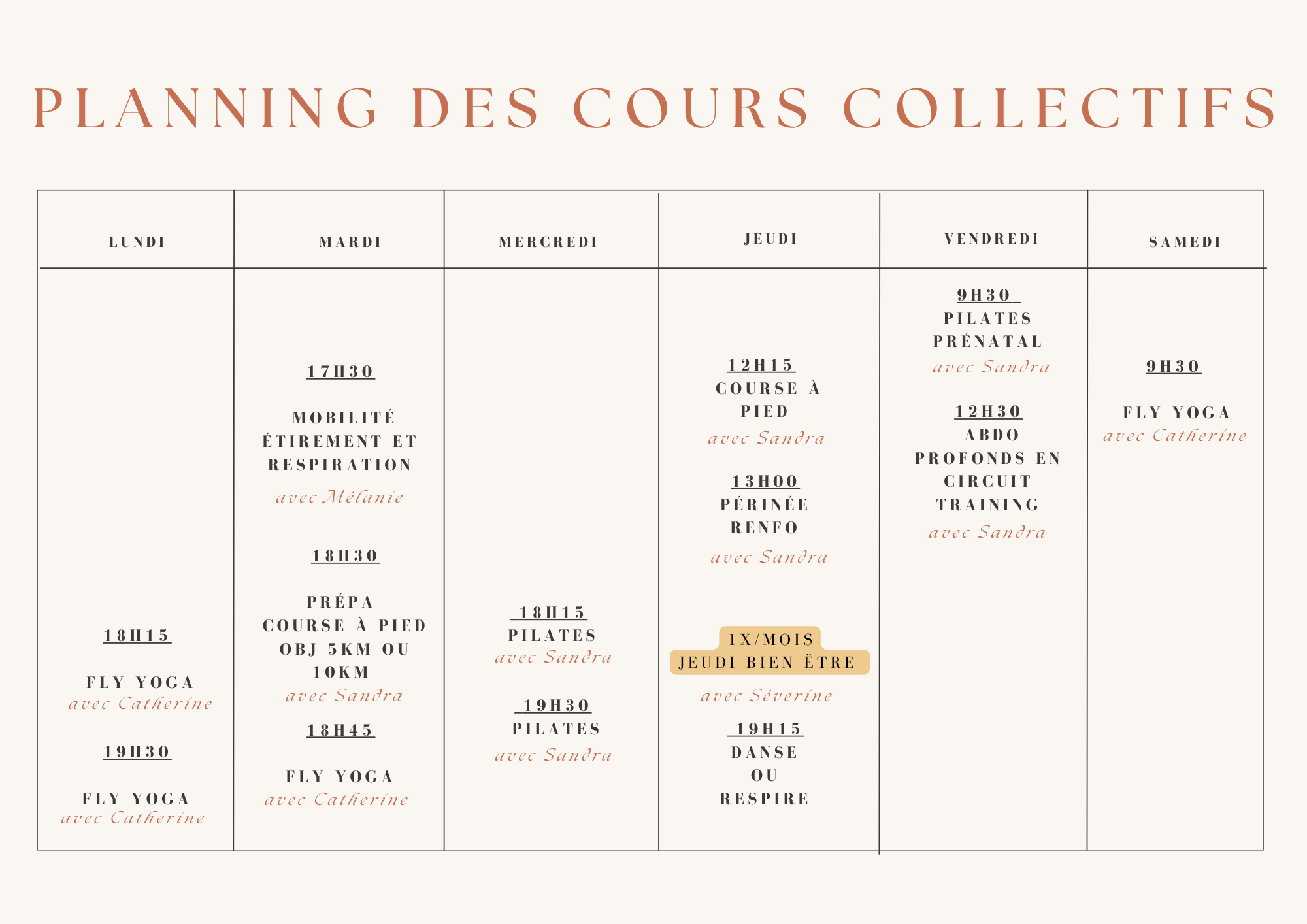 La Casa Nana a à cœur de vous accompagner en vous offrant un parcours de santé complet. Il nous a donc semblé évident de proposer des cours collectifs pour vous aider à vous mettre en mouvement grâce à des cours de Fly Yoga, de Pilates, de Yoga, de Danse, de Mobilité permettant ainsi aux femmes de garder leur corps mobile, dynamique et d'optimiser leur santé et leur bien-être au quotidien !